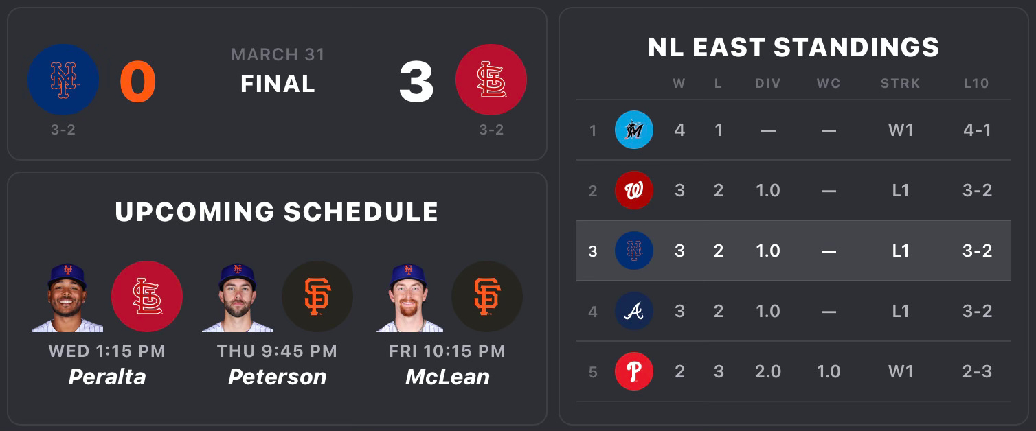 🗓️ UP NEXT: A matinee affair to close out the series in St. Louis. Freddy Peralta makes his second start of the year against southpaw Matthew Liberatore. Facing a lefty, Mark Vientos is expected to emerge from the bowels of the Mets’ locker room for his first start of the season.