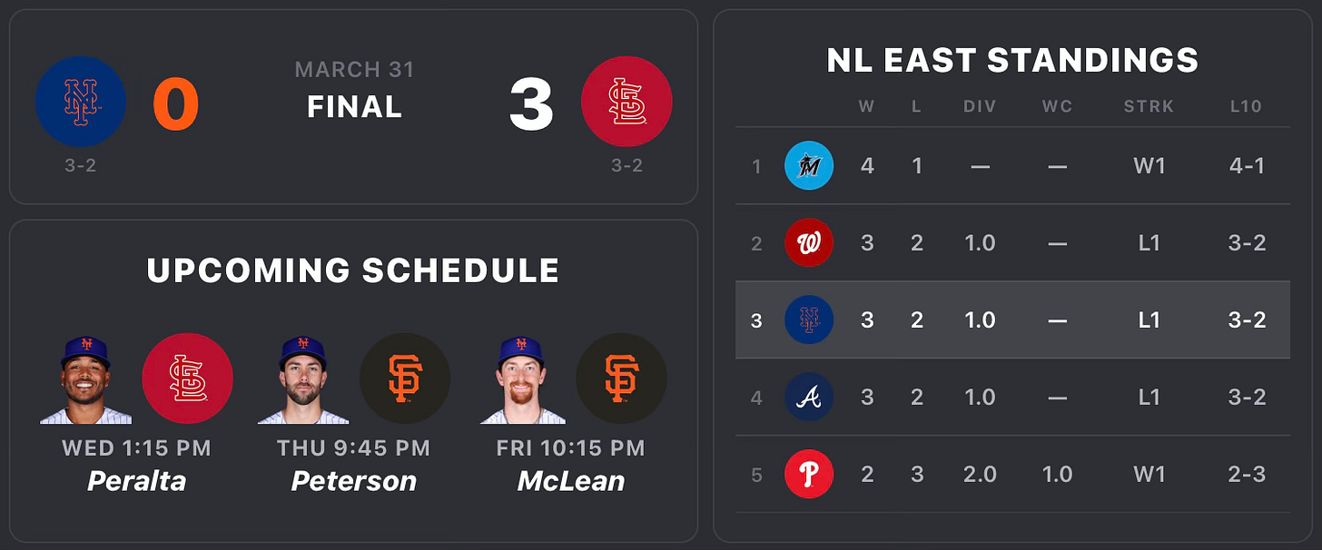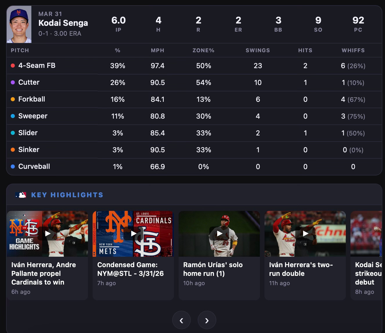 📲 METS FIX SITE: I continue to update the Mets Fix site based on your feedback and new ideas. Most recently, I added a “Starter Snapshot” card that tracks the most recent starter and shows you their pitch mix statistics. You can also find “Key Highlights” from the most recent contest. Both of these features appear alongside the live scorebug so you can track progress during the game (and review the next morning). Note: The key highlights are linked to MLB pages. There are also several videos embedded in the site, such as SNY interviews and a new section that shows top performances from around the league.