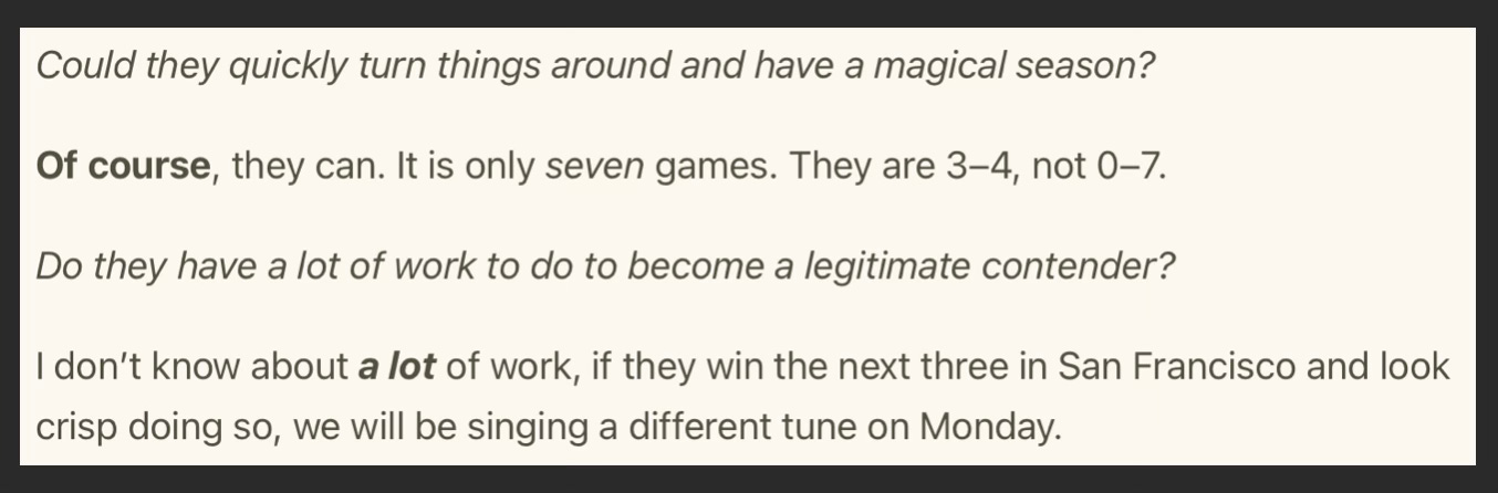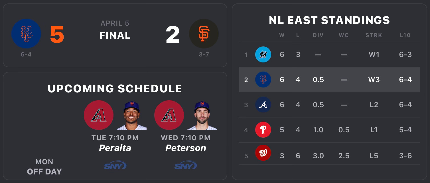 The projection systems see the Amazins as a ~90 win team. That’s the 50th percentile outcome. We know there are permutations that put them at 97 wins, as they are on pace for now, and scenarios where they only win 80. We’ve seen both versions on the field over the first two weeks. It’s why sample size does in fact matter. The ups and downs will come. The way we were feeling on Friday might not always match the way we feel the following Monday.