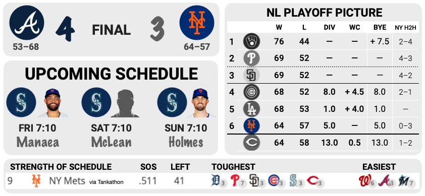 ▶️ It doesn’t get any easier with the Mariners coming to town. You figure the Brewers will eventually lose again, but they could help the Mets this weekend against Cincinnati. Nothing matters until the Amazins find a way to start winning baseball games again.