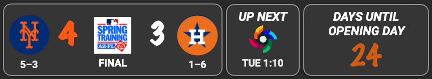 ⇢ Laser beam: The ball looked like a laser coming off Taylor’s bat in the fourth inning. At 108.3 mph, it topped his 106-mph home run last week as the hardest-hit homer by a Met this spring. While the fireworks belonged to the veteran, Benge actually topped him for the hardest hit ball of the day, an 110-mph groundout in the first that had an expected batting average of .540.