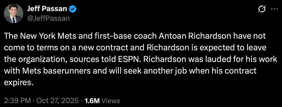Antoan Richardson will not return as the Mets’ first base coach in 2026.