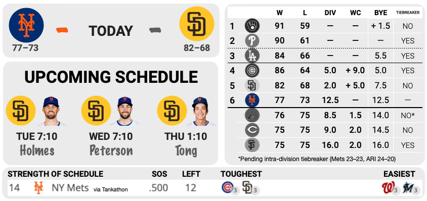 🤪 GETTING WILD: The Amazins welcome the Padres to Citi Field this week with a minuscule 1.5-game lead over Arizona for the final wild card spot. The Diamondbacks dominated the Giants last night to pick up a 1/2 game in the standings.